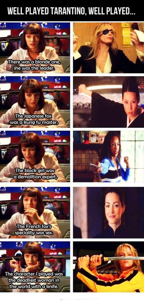 Além disso, quem não se lembra de uma ideia de programa que Mia Wallace teve lá em Pulp Fiction? Ela explica as personagens que se parecem bastante com as existentes em Kill Bill. Não se esqueça da fala: “A personagem que eu interpreto é a mais mortal de todas mulheres do mundo com uma faca”, Mia conta para Vincent.